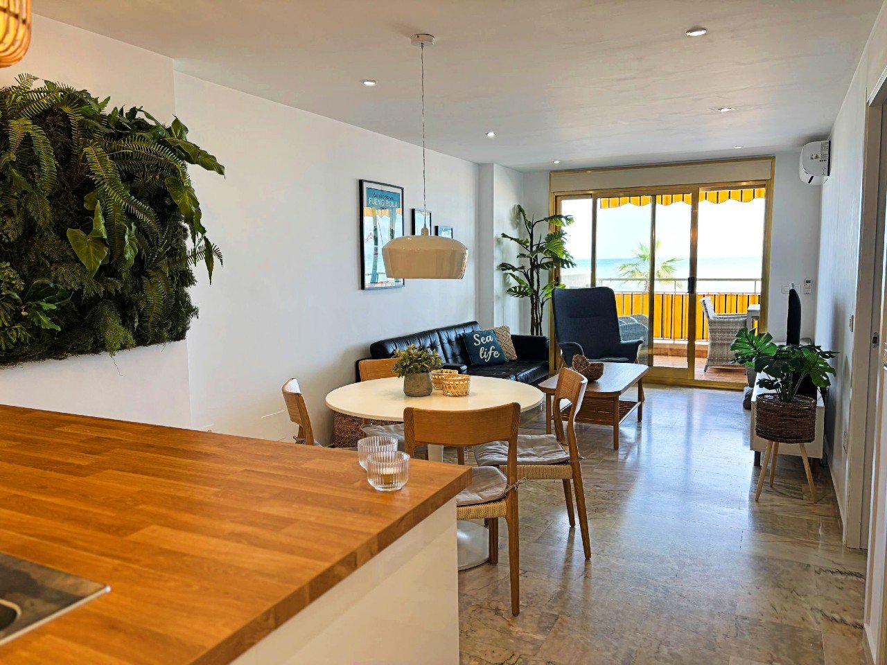 Fantastisk strandlejlighed på Paseoen er totalrenoveret fra A til Z i 2019 i lyse venlige farver og omgivelser samt nye lækre møbler, boligen er en handicapvenlig feriebolig med plads til kørestol og ældre samt gangbesværede, i bygningen er der elevator samt ramper hvor dette er nødvendigt i forhold til adgang til bolig og poolområde, poolen er ligeledes udstyret med lift til at komme i poolen hvis der er brug for dette. Ferieboligen indeholder fuldt udstyret åbent køkken ind til stuen. Kombineret spisestue og stue med TV arrangement samt udgang til terrassen hvorfra du har udsigt til Paseoen, stranden og Middelhavet, terrassen er møbleret med spisebord og stole samt et par lounge chairs ligeledes er der markise hvis solen bliver lidt for hård :-) 2 gode soveværelser med indbyggede garderobeskabe. 2 badeværelser hvoraf det en er forberedt og klar til kørestol samt ældre og gangbesværede. Boligen er udstyret med varm/kold aircondition i stue og værelser. Fiberinternet er installeret i boligen