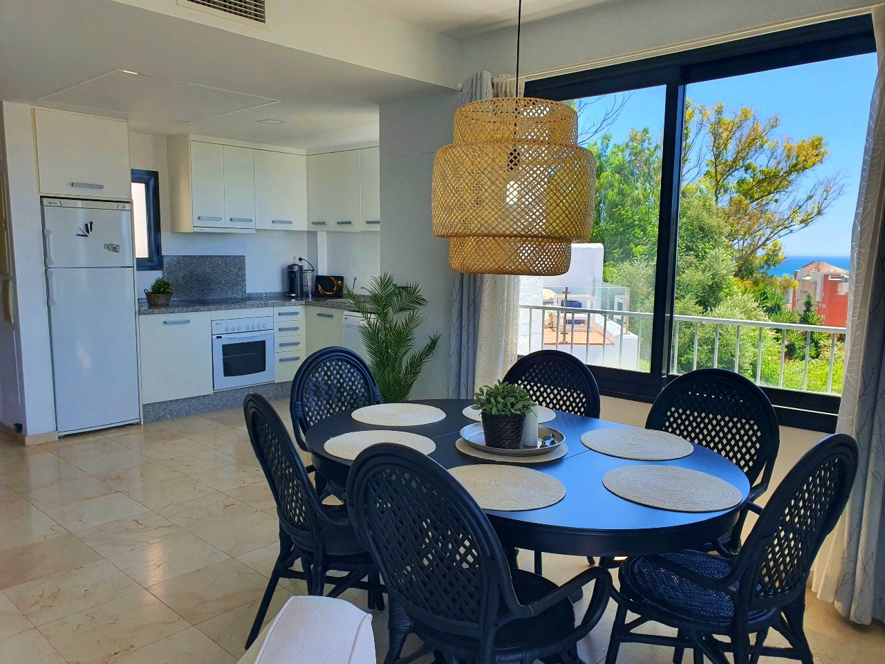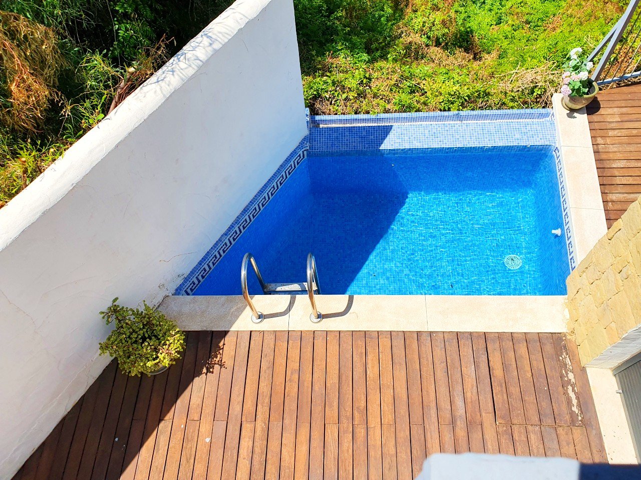 Feriebolig med privat pool er fordelt på 3 etager med stue og køkken i stueetagen, fra stuen er der en mindre terrasse fra hvor man har en uovertruffen udsigt over Fuengirola og Middelhavet (hvem kunne ikke tænke sig at sidde og sippe lidt koldt Rose vin og nyde den fantastiske udsigt) 3 soveværelser med garderobeskabe samt 3 badeværelser, fra nederste etage er der udgang til flere terrasser samt den private splashpool. Boligen er udstyret med fiberinternet samt varm/kold aircondition. Til boligen hører der 1 privat parkeringsplads. Der er ligeledes adgang til en fælles infinitypool