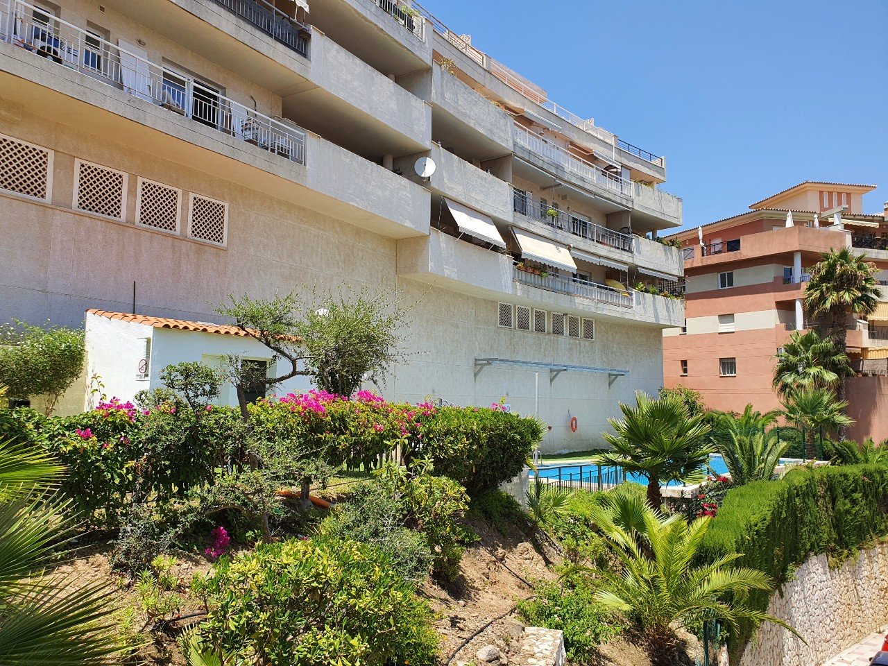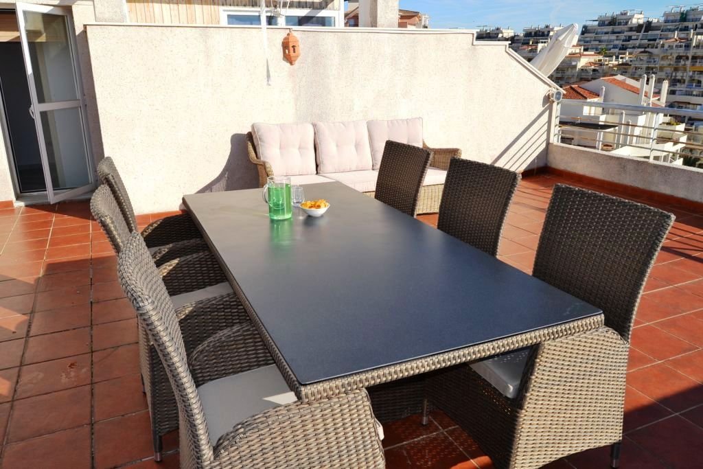 Ferieboligen tilbyder god plads og en god fordeling af rummene hvilket gør at man kan slappe 100% af i denne lejlighed, Lejligheden indeholder et dejligt fuldt udstyret køkken. Fordelingsgang med trappe op til den store tagterrasse hvorfra man har en fantastisk udsigt over Middelhavet og kysten, på tagterrassen er der sol fra morgen til aften, tagterrassen er møbleret med spisebord med stole, sofa, solsenge, parasol og grill alt hvad der kræves til at slappe af med en god bog eller til at få noget kulør på kroppen. Stor stue med sofaarrangement og fladskærms TV samt spisebord, fra stuen er der udgang til en mindre terrasse med et bord og stole. 2 soveværelser med indbyggede garderobeskabe. 2 nyrenoverede badeværelser med brusekabiner. Boligen er udstyret med varm/kold aircondition. WIFI/internet er også til rådighed i boligen. Privat parkering i parkeringskælder. Dejlig fællespool