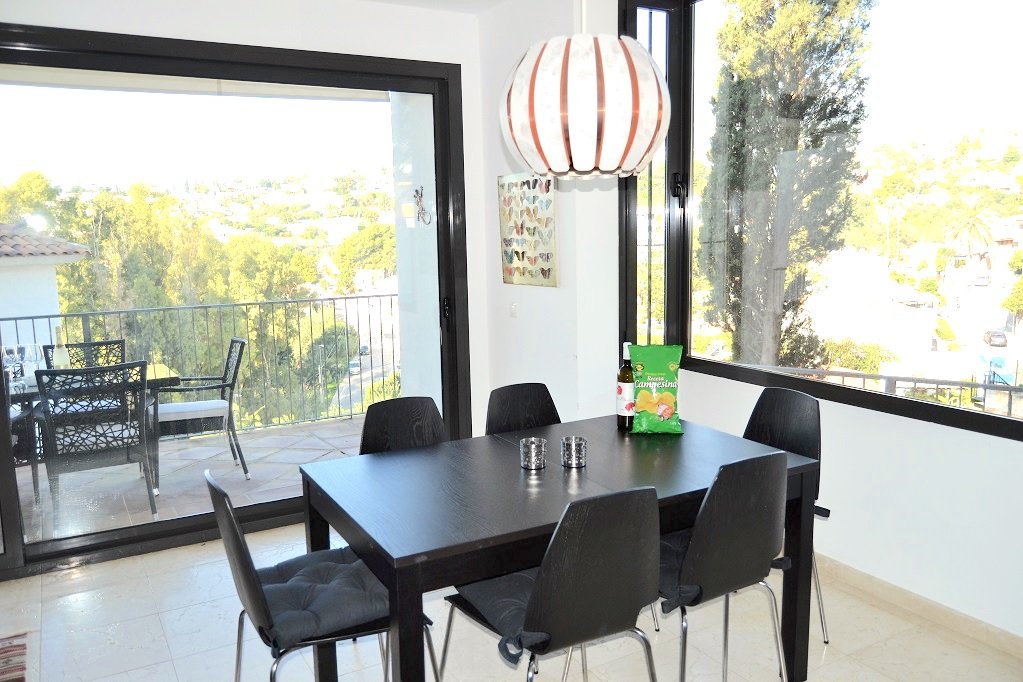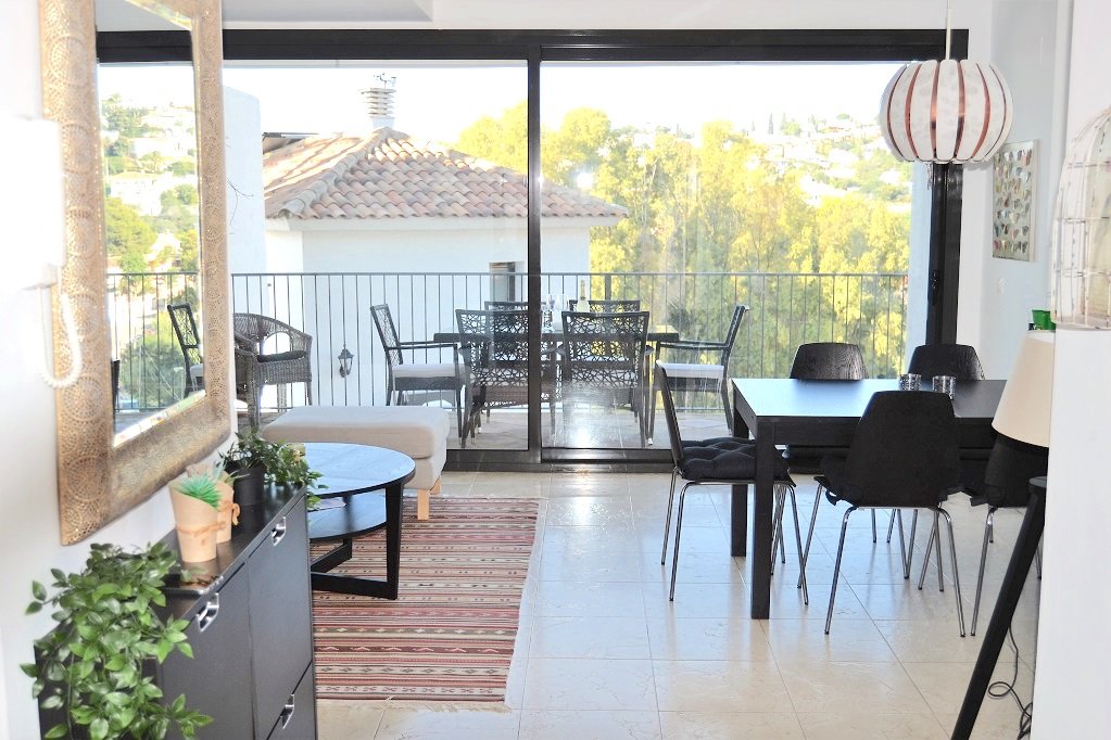 Boligen indeholder dejligt lyst fuldt udstyret køkken. Lys stue med sofaarrangemet og TV. Stor terrasse med havemøbler og weber grill fra hvor man har en udsøgt udsigt over bjergkammen bag Mijas og Fuengirola. Gæstetoilet. Master bedroom med ensuite badeværelse og indbyggede garderobeskabe og yderligere 2 soveværelser med enkelt senge og garderobeskabe samt 2 badeværelser. Boligen er fuldt udstyret med aircondition. WIFI/internet. Privat parkering. Boligen er møbleret i skandinavisk stil.