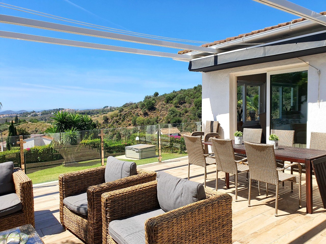 Den store terrasse er stor nok til både et afsætningsområde og et stort spisebord. Der er også en lille bar.