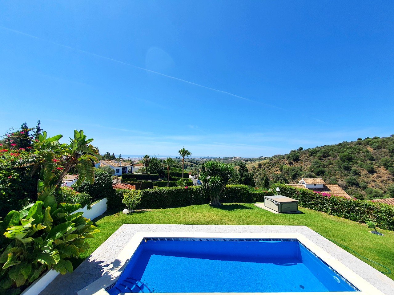 Super villa med privat pool... Beliggende i det rolige og meget eftertragtede område Dona Pilar midt imellem Fuengirola og Mijas Pueblo. Denne ejendom tilbyder en fredfyldt flugt fra bylivets stress og jag. Du er stadig tæt på alle de faciliteter, du kunne få brug for.