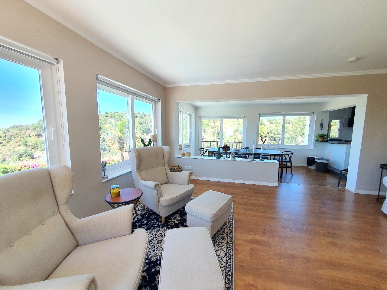 Opholdsstuen er lys og luftig med et åbent design, der problemfrit forbinder stue, spiseplads og fuldt udstyret køkken.