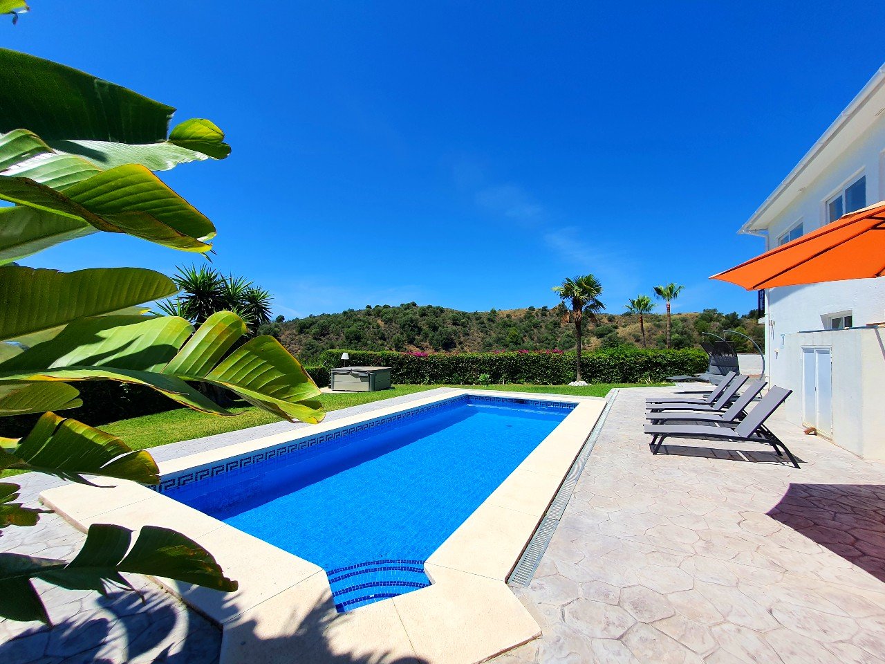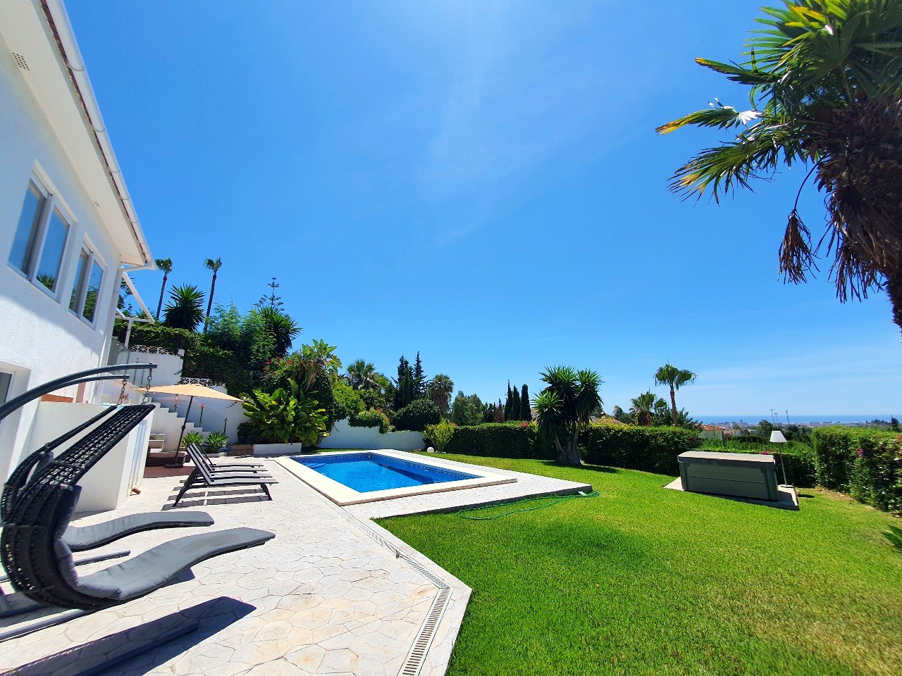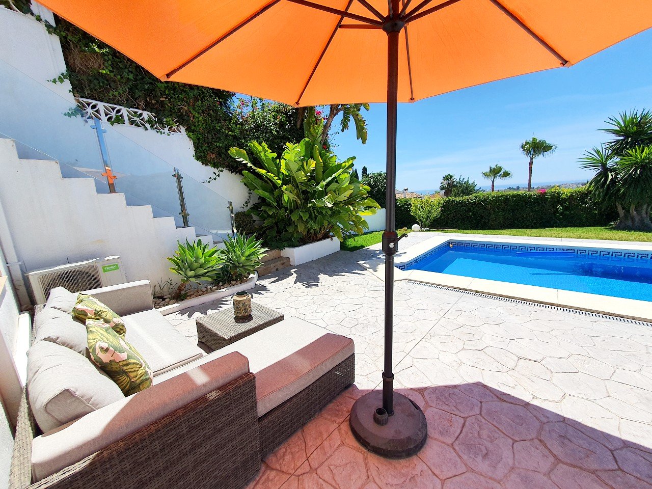 Udenfor byder villaen på en smuk frodig have med privat swimmingpool, perfekt til at køle af på varme sommerdage.