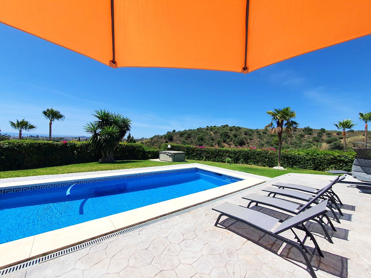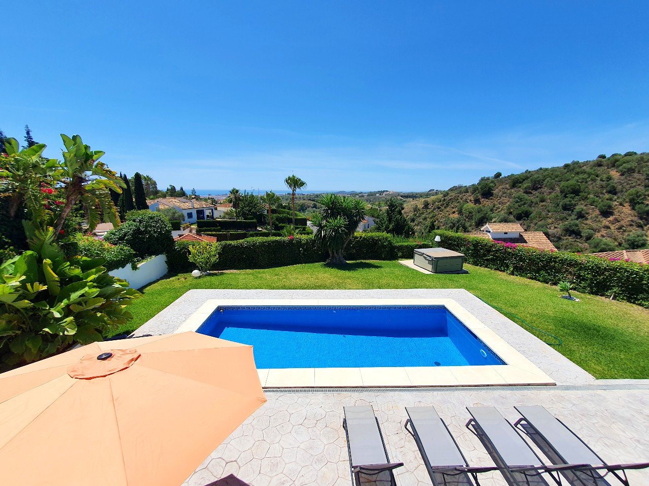 Super villa med privat pool og 4 soveværelser samt 4 badeværelser. Åben plan mellem køkken og stue og en magisk panoramaudsigt.
