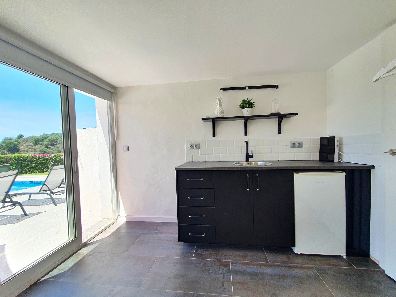 I stueetagen (ved poolen) finder man det 4. soveværelse med eget badeværelse med bruser. Der er også et lille køkken med køleskab, induktionskomfur og en vask. Der er privat indgang til værelset.