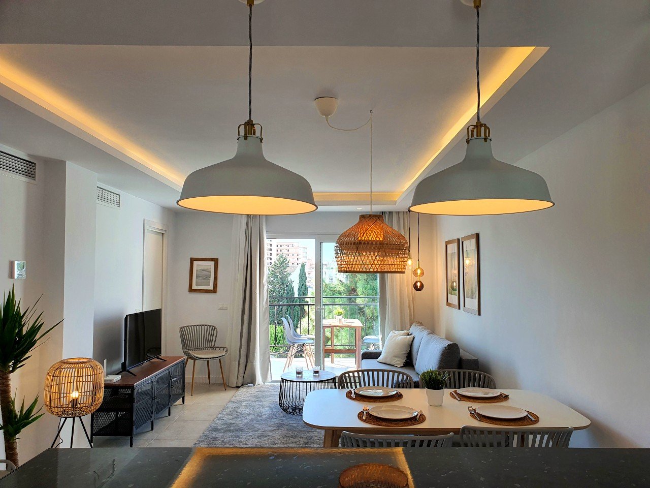 Ferieboligen er nyrenoveret og møbleret med gode kvalitetsmøbler, boligen indeholder fuldt udstyret åbent køkken i forbindelse med den kombineret lyse stue og spisestue, stuen er smagsfuldt møbleret, fra stuen er der udgang til terrassen som er udstyret med spiseplads, fra terrassen er der udsigt over det skønne pool og fællesområde. 2 skønne og lyse soveværelser med komfortable senge. 2 komplette badeværelser med brus. Boligen er fuldt udstyret med varm/kold aircondition. Fiberinternet er tilgængeligt i ferieboligen.